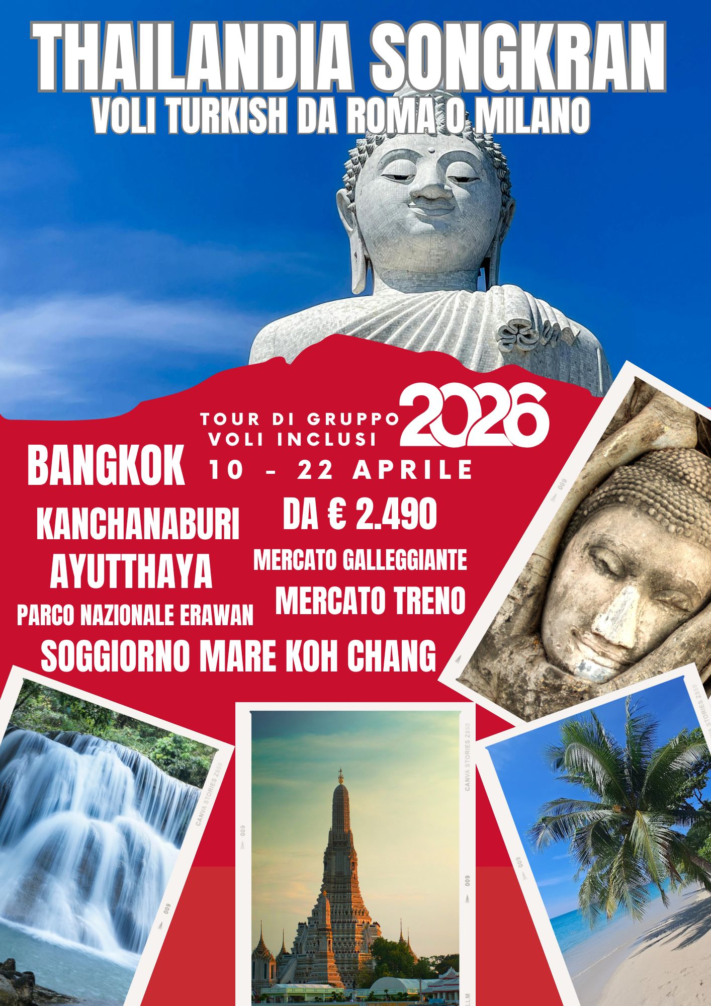 Arrivo a Bangkok Thailandia l'11 Aprile: 11 giorni 10 notti in Thailandia. 2 giorni a Bangkok con 1 giorno di visite a: Palazzo Reale e Templi di Bangkok. Tour di 4 giorni 3 notti alla scoperta del Mercato Galleggiante e Mercato sulla Ferrorvia, la provincia di Kanchanaburi con le sue cascate la natura lussureggiante del Parco Nazionale di Erawan e il famigerato Ponte Kwai Ferrovia della Morte teatro della II Guerra Mondiale, Ayutthaya antica Capitale UNESCO e i suoi templi magici. Trasferimento via terra e via mare attraverso un meraviglioso tratto di Thailandia sino a Trat dove ci imbarcheremo per l'Arcipelago Mu Ko Chang: 6 giorni 5 notti di soggiorno mare sulle candide spiagge dell'isola tropicale di Koh Chang dove potrai decidere se rilassarti o divertirti e/o fare meravigliose escursioni. Il giorno 21 Aprile ritorno via mare e via terra da Koh Chang sino a Bangkok dove prenderete il volo di ritorno per l'Italia.