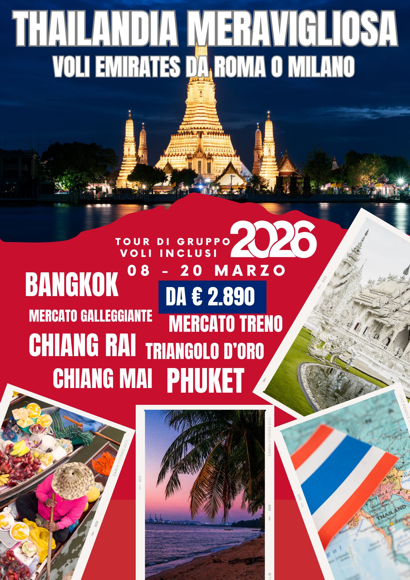 Arrivo a Bangkok Thailandia il 9 Marzo. 11 giorni 10 notti in Thailandia: 3 giorni a Bangkok di cui 2 di visite: Palazzo Reale e Templi di Bangkok (10 Marzo), Mercato sulla Ferrovia e Mercato Galleggiante (11 Marzo). Volo interno su Chiang Rai: 4 giorni di tour nel Nord Thailandia con visite a Chiang Rai, Triangolo d'Oro e Chiang Mai. Volo interno su Phuket. 5 giorni di soggiorno mare sulle candide spiagge dell'isola tropicale di Phuket dove potrai decidere se rilassarti o divertirti e/o fare meravigliose escursioni. Partenza da Phuket il 19 Marzo.