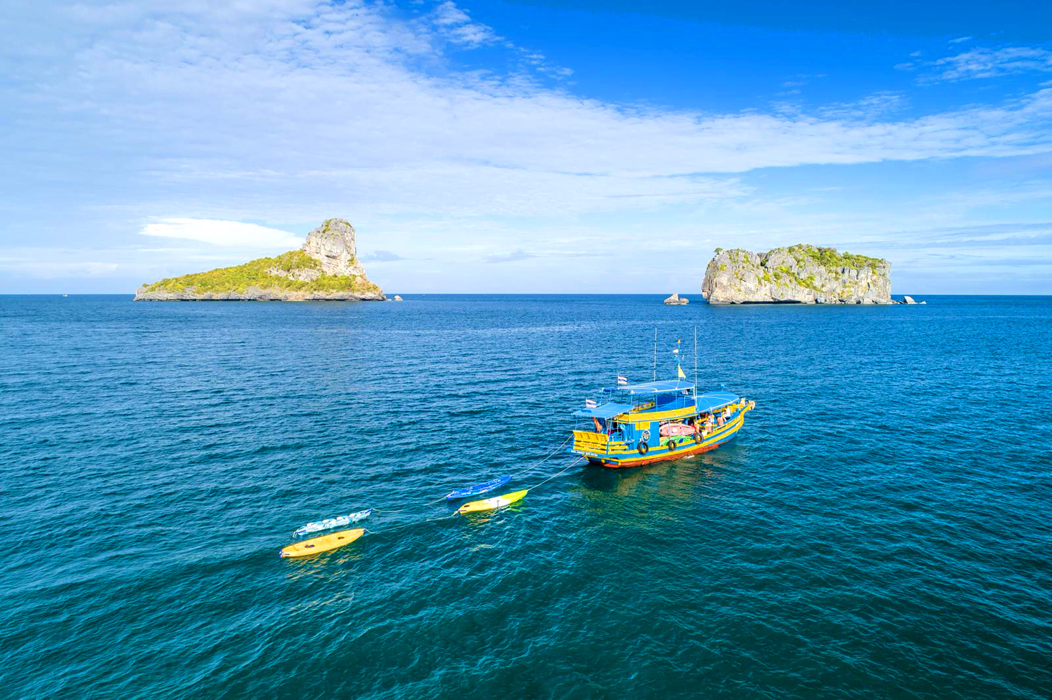 Crociera in barca alla scoperta del meraviglioso Ang Thong National Marine Park: kayak tra grandi rocce carsiche, trekking verso punti panormaici mozzafiato, snorkeling in acque azzurro limpido e relax su spiagge di sabbia bianca. Il Parco Nazionale Naturale di Mu Koh Ang Thong è un Arcipelago formato da 42 isole selvagge e incontaminate a sud di Koh Tao a est di Koh Samui e Koh Phangan
